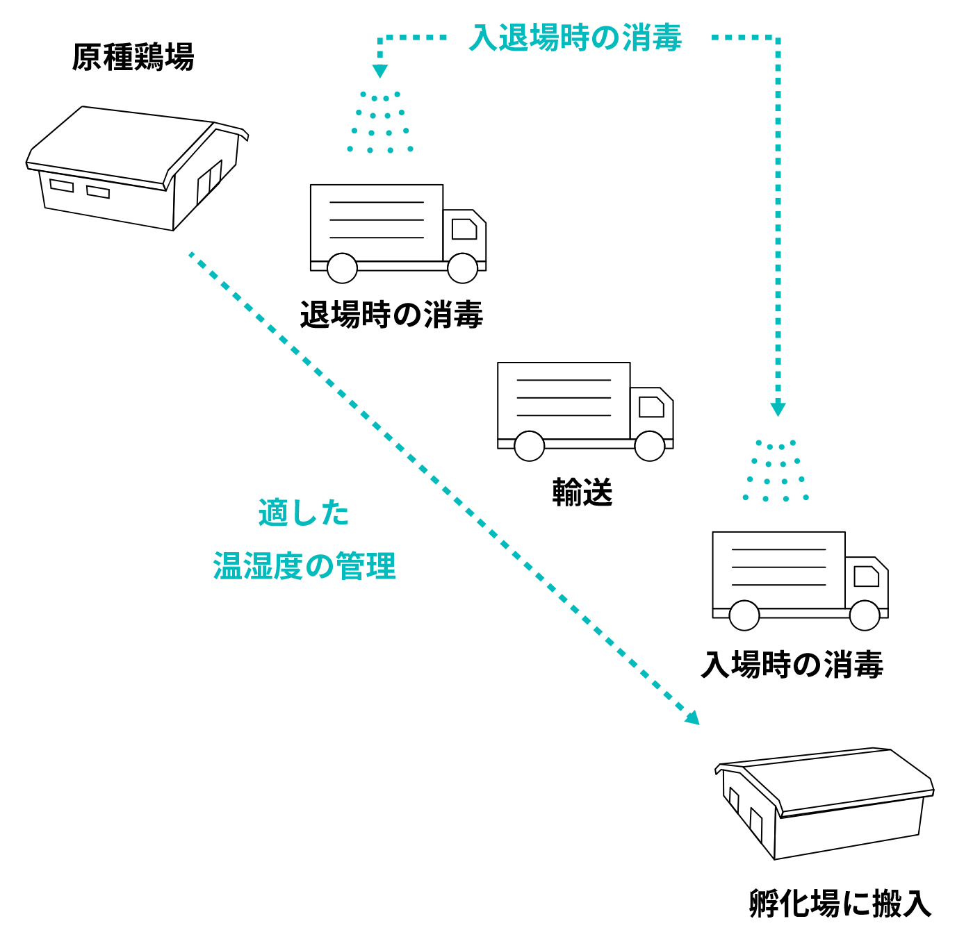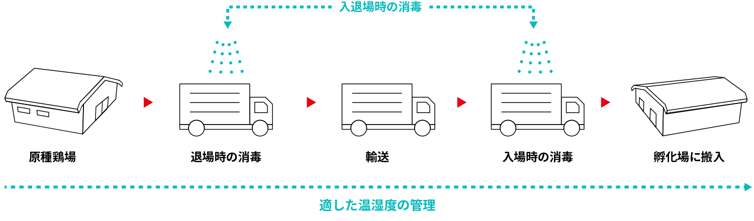原種鶏場・孵化場に出入りする車両は必ず消毒を行い、「病原体を持ち込まない、持ち出さない」の管理を徹底しています。
