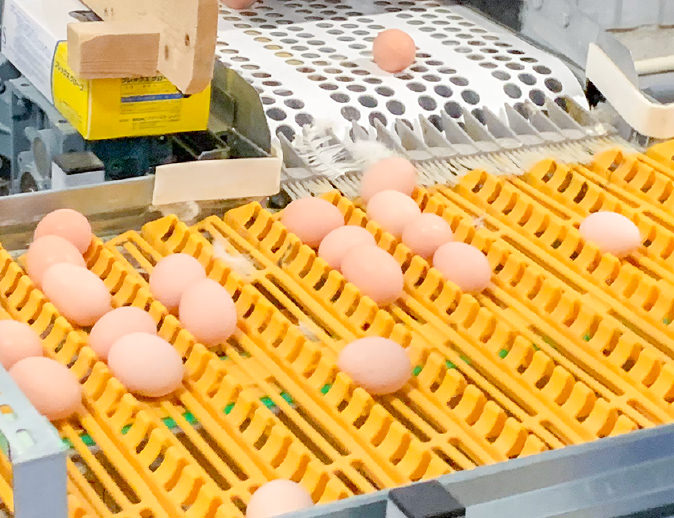 たくさんの種卵を採卵するため、種卵への衝撃を防ぐシステムを備えた機械で自動採卵を行っており、将来を見据えた省力化、省人化を進めています。